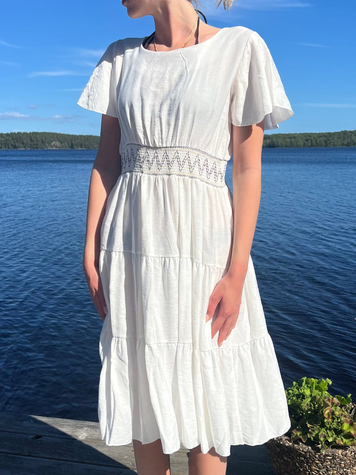 Vit knälång klänning med markerad midja med mönster.